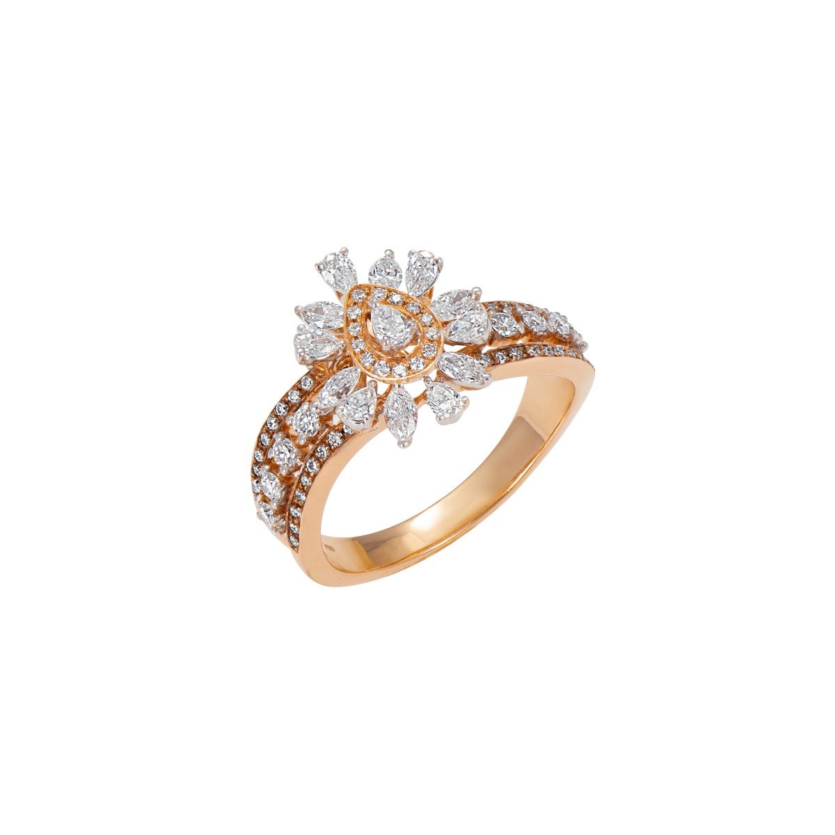 Attributes: 18K Rose Gold, Ring, Diamonds, Flower Design